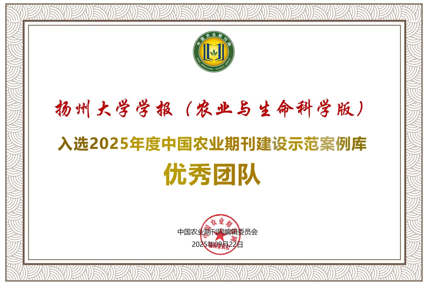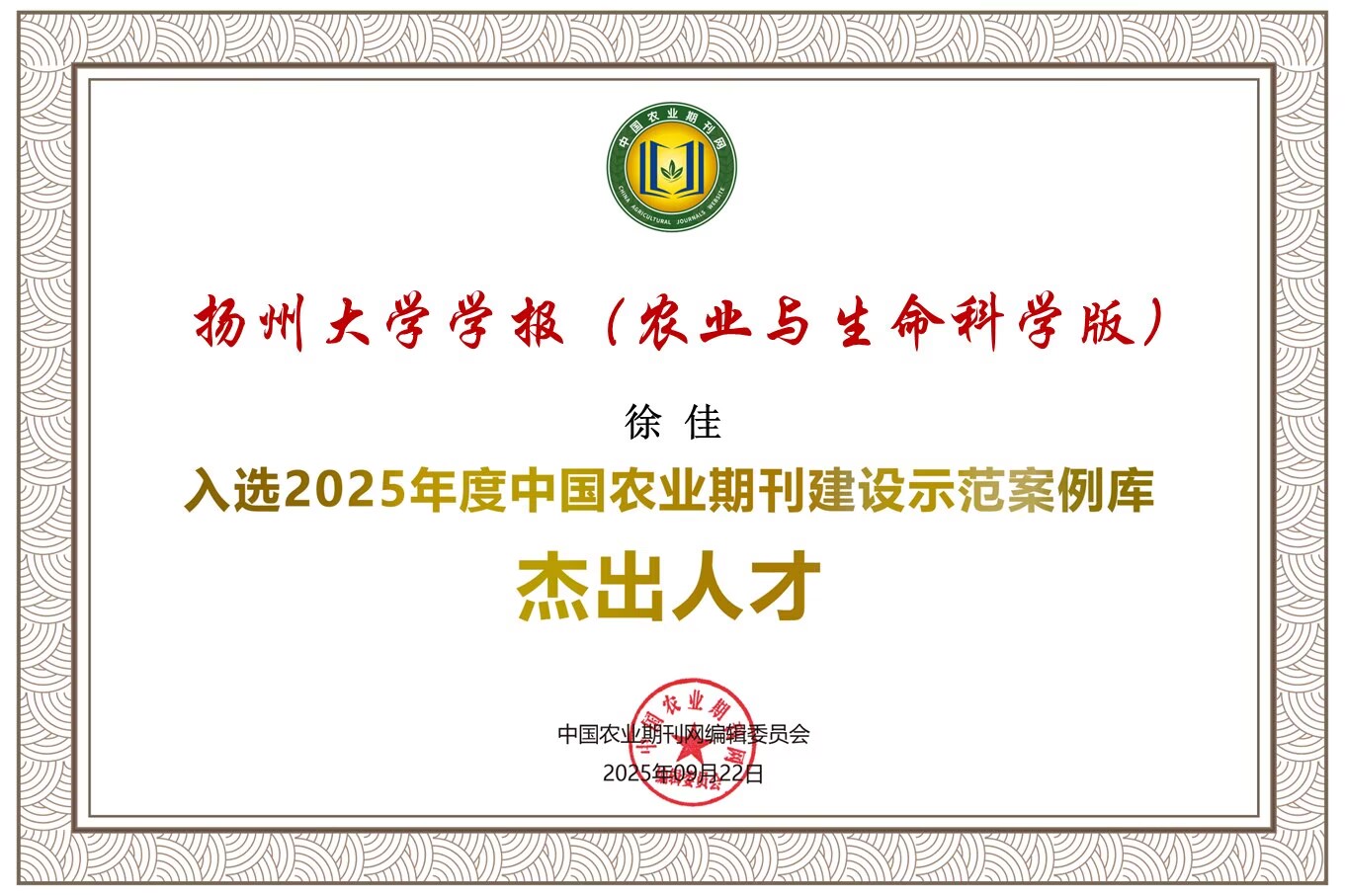 9月21日—24日,2025 年中国农业期刊学术年会在广州隆重召开。会上发布了2025 年度中国农业期刊行业“三优项目”等7类优秀案例入选结果,扬州大学学报(农业与生命科学版)入选“2025年度中国农业期刊建设示范案例库 •优秀团队”,徐佳编辑入选“2025年度中国农业期刊建设示范案例库• 杰出人才”。