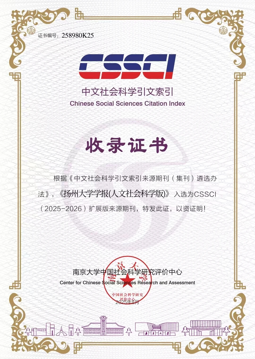 日前,根据《中文社会科学引文索引来源期刊(集刊)遴选办法》,南京大学中国社会科学研究评价中心评定,《扬州大学学报(人文社会科学版)》入选为CSSCI(2025—2026)扩展版来源期刊。